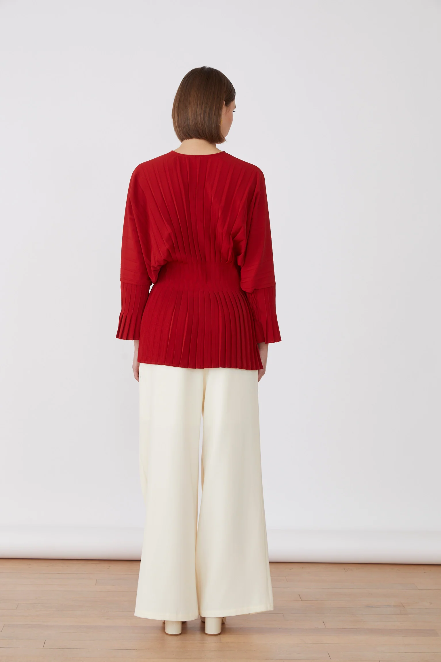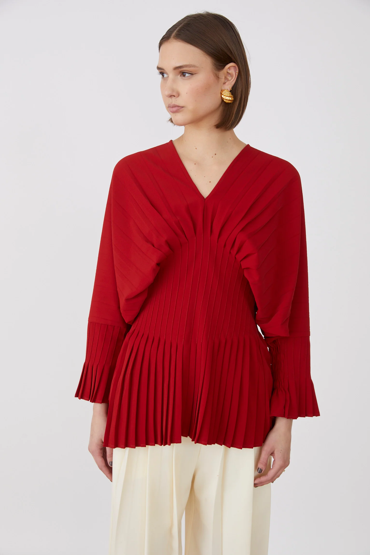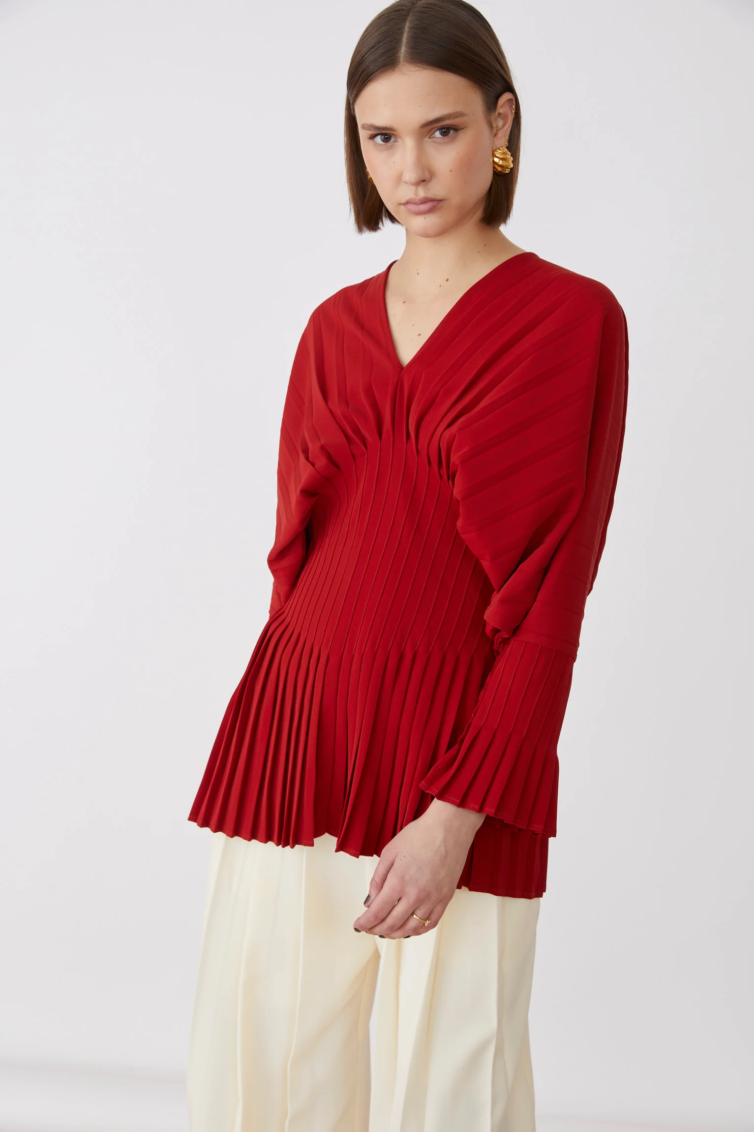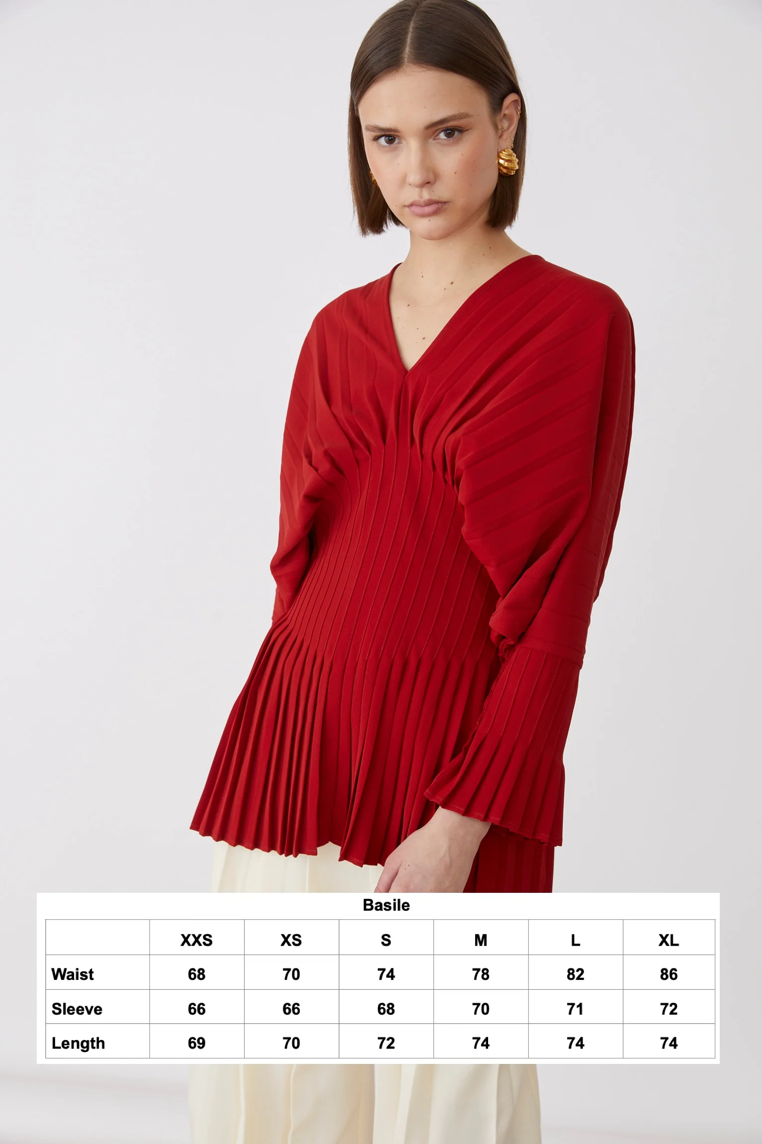 Η μπλούζα Basile διαθέτει εκλεπτυσμένο ντεκολτέ V και στενή μέση που κολακεύει τη σιλουέτα σας με διακριτική κομψότητα. Οι φαρδιές μανσέτες της προσθέτουν μια χαριτωμένη πινελιά, ενώ το πτυχωτό κάτω μέρος δημιουργεί απαλή κίνηση για ένα εκλεπτυσμένο φινίρισμα. Ιδανική για να αναβαθμίσετε την γκαρνταρόμπα σας με διακριτικό στυλ.
