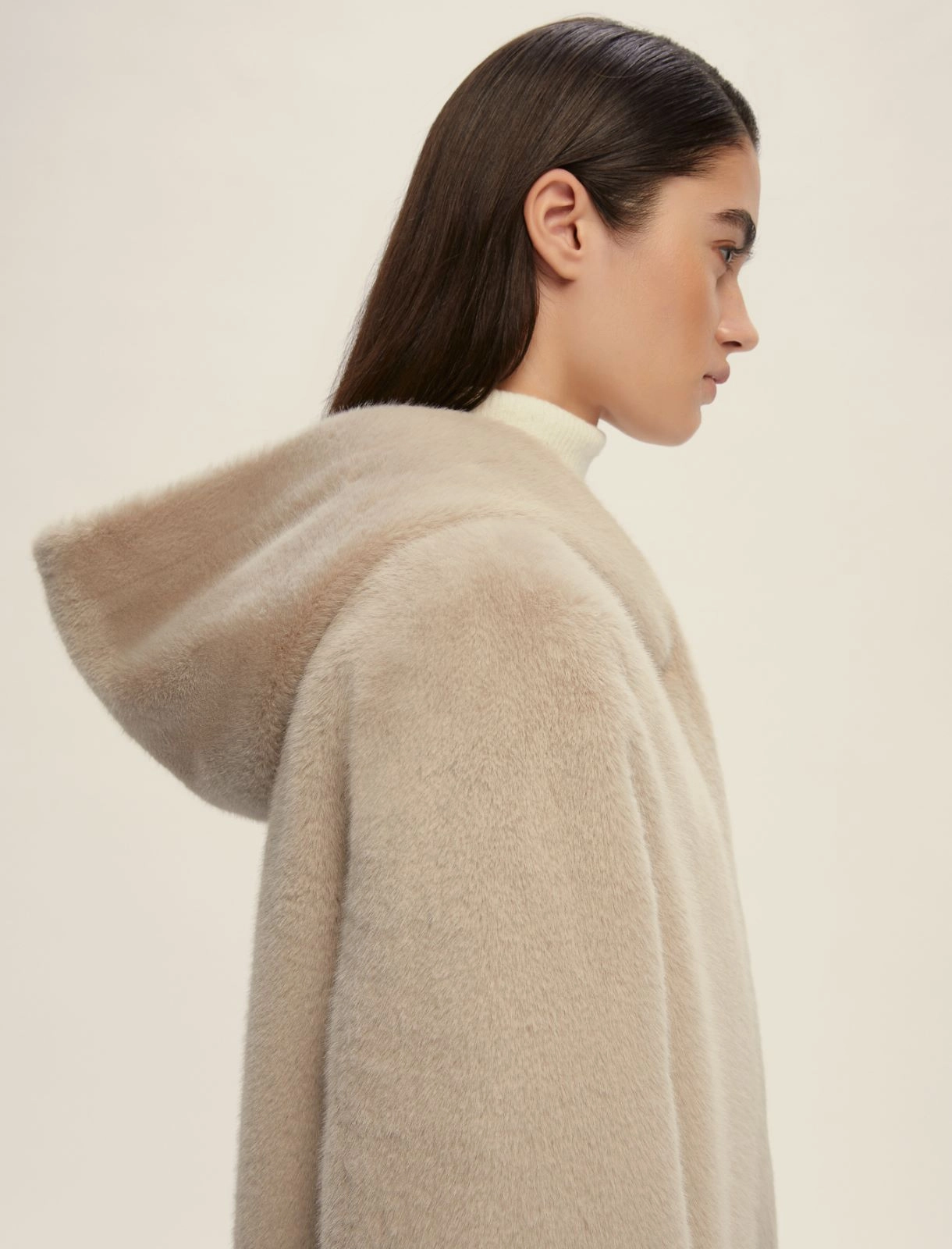 Δύο ψυχές με ένα ενιαίο στυλ. Αυτό το παλτό διπλής όψης συνδυάζει βελούδινη κάτω πλευρά με απαλή εξωτερική πλευρά για μια εκλεπτυσμένη και μοντέρνα αισθητική. Η ίσια εφαρμογή και η κουκούλα το καθιστούν ιδανικό για δυναμικές μέρες, είτε βρίσκεστε στην πόλη είτε φεύγετε για το Σαββατοκύριακο.