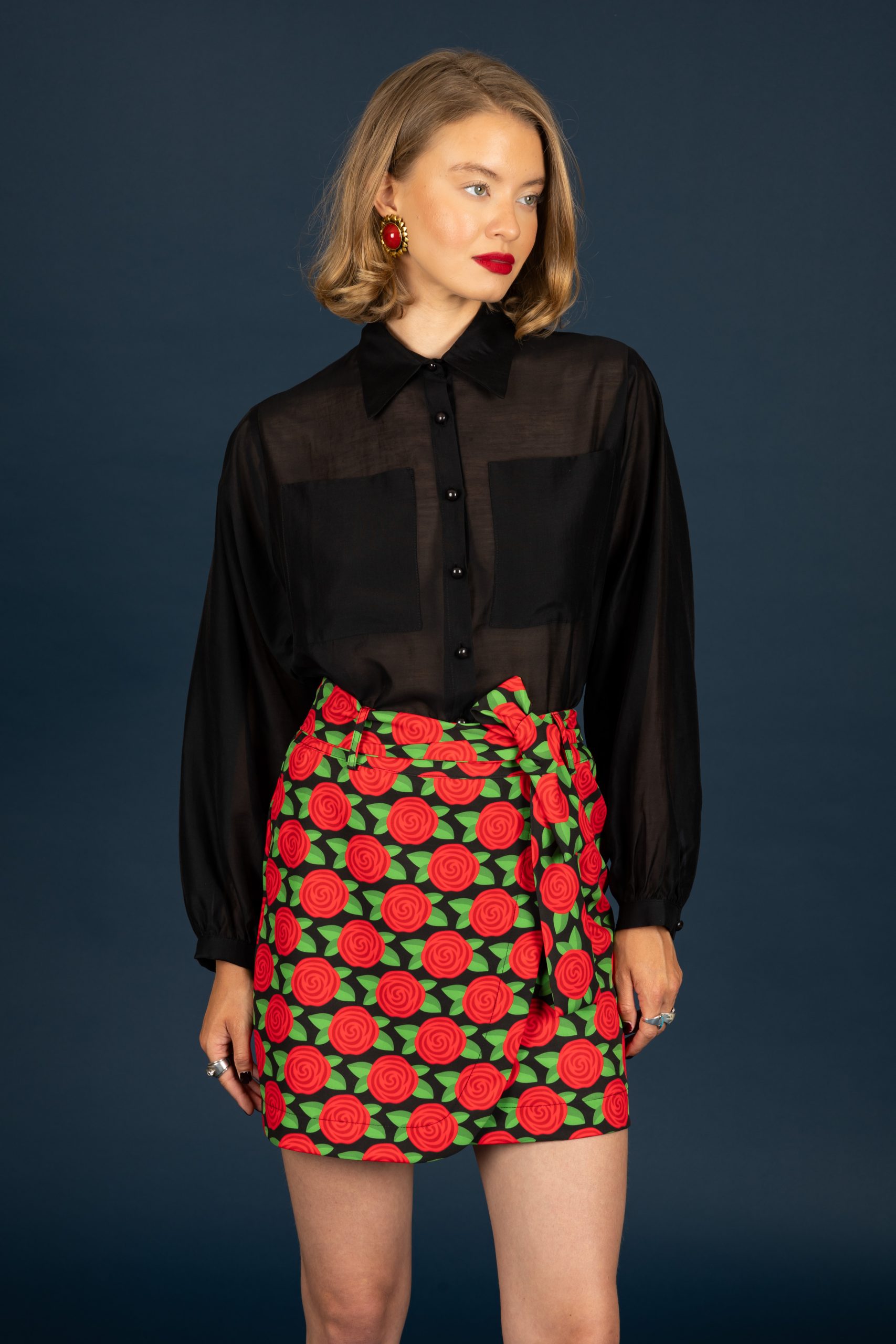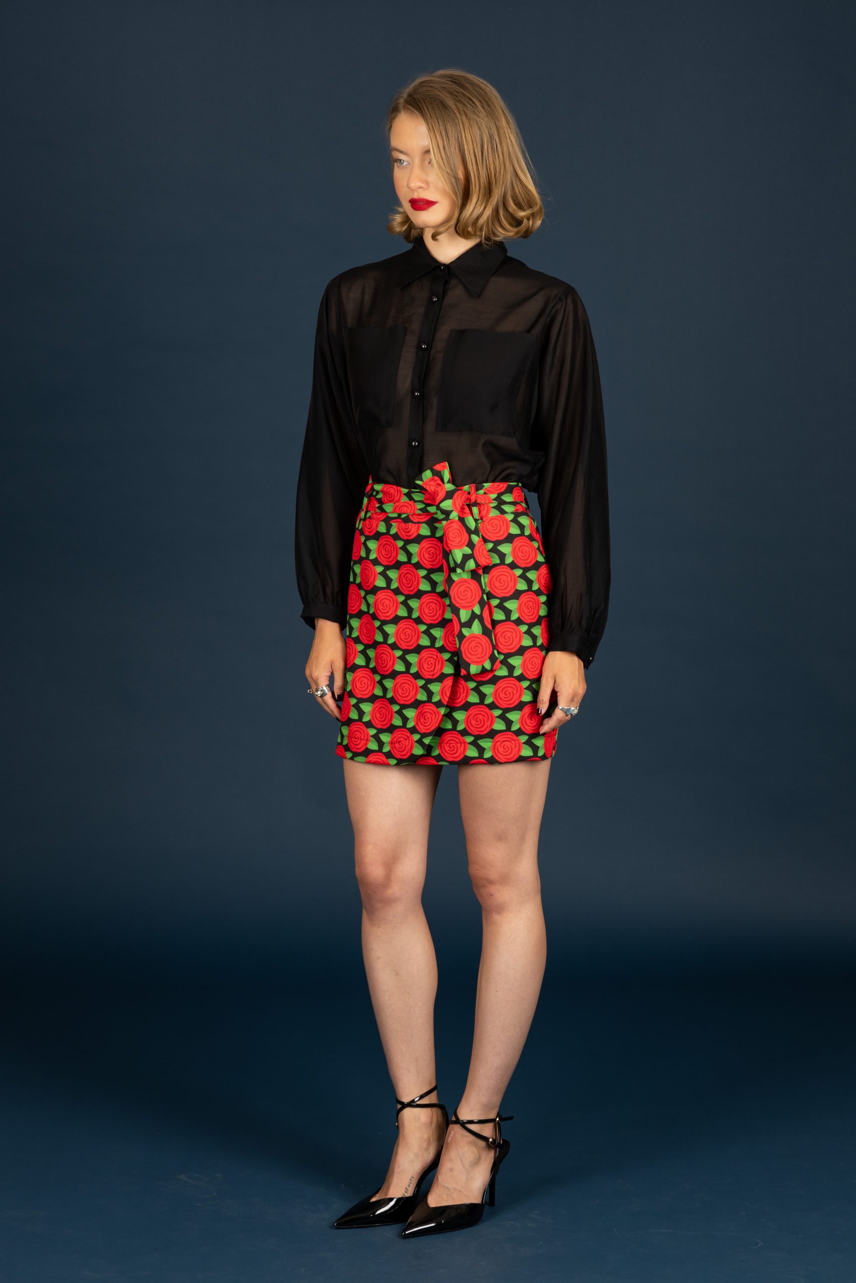 Φέρτε χρώμα και θηλυκότητα στην εμφάνισή σας με αυτή τη μοναδική mini φούστα σε έντονο floral μοτίβο. Το σχέδιο με κόκκινα τριαντάφυλλα και πράσινα φύλλα δημιουργεί ένα statement αποτέλεσμα, ενώ το πλαϊνό διακοσμητικό δέσιμο προσθέτει κομψότητα.