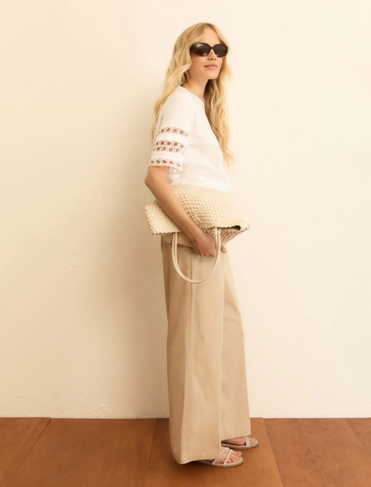 Emme Marella-Emmcalao μπεζ φαρδιά παντελόνα με λάστιχο στη μέση και ρυθμιζόμενο κορδόνι.