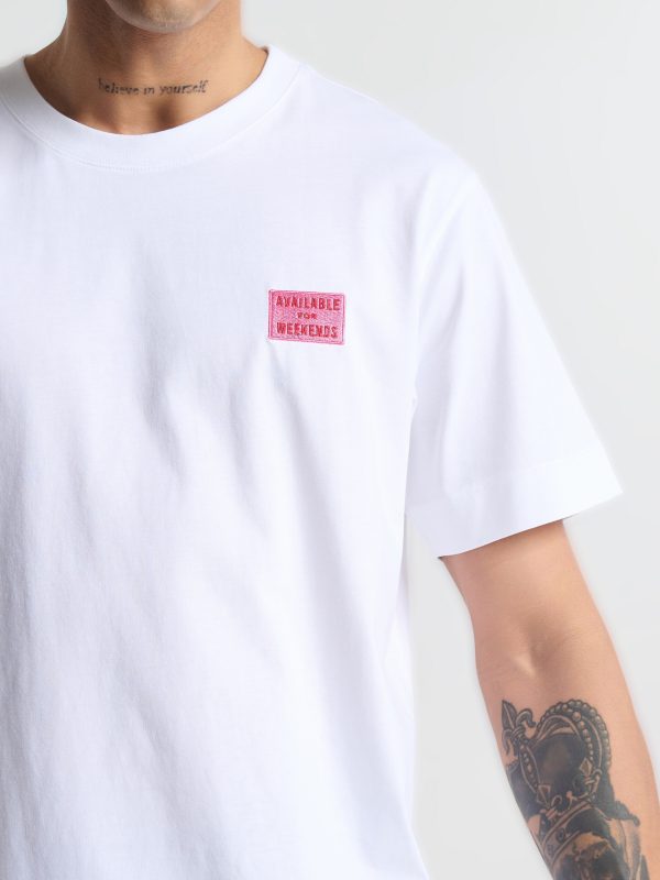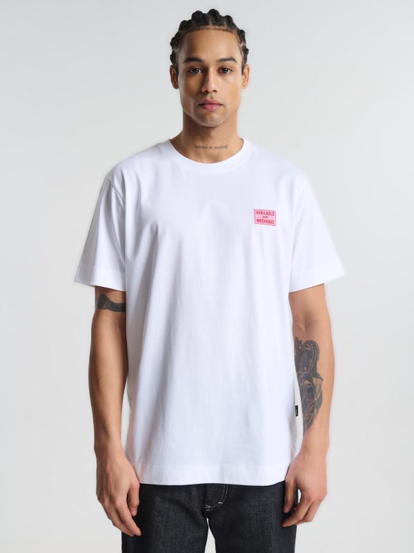 Κοντομάνικο λευκό με λευκό τύπωμα στο στήθος και ετικέτα με το λογότυπο στο πλάι.Κανονική εφαρμογή και ρίπ λαιμόκοψη.