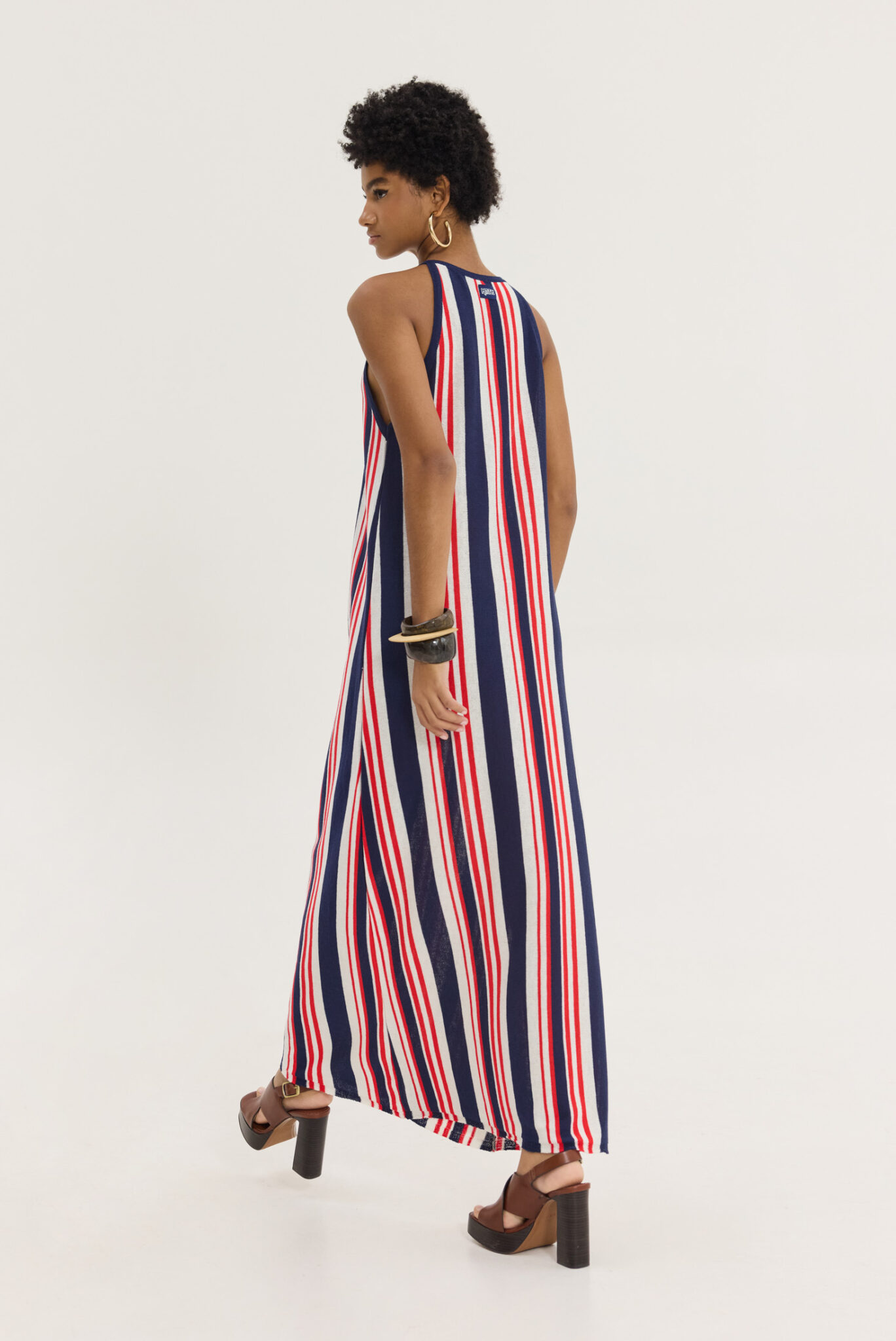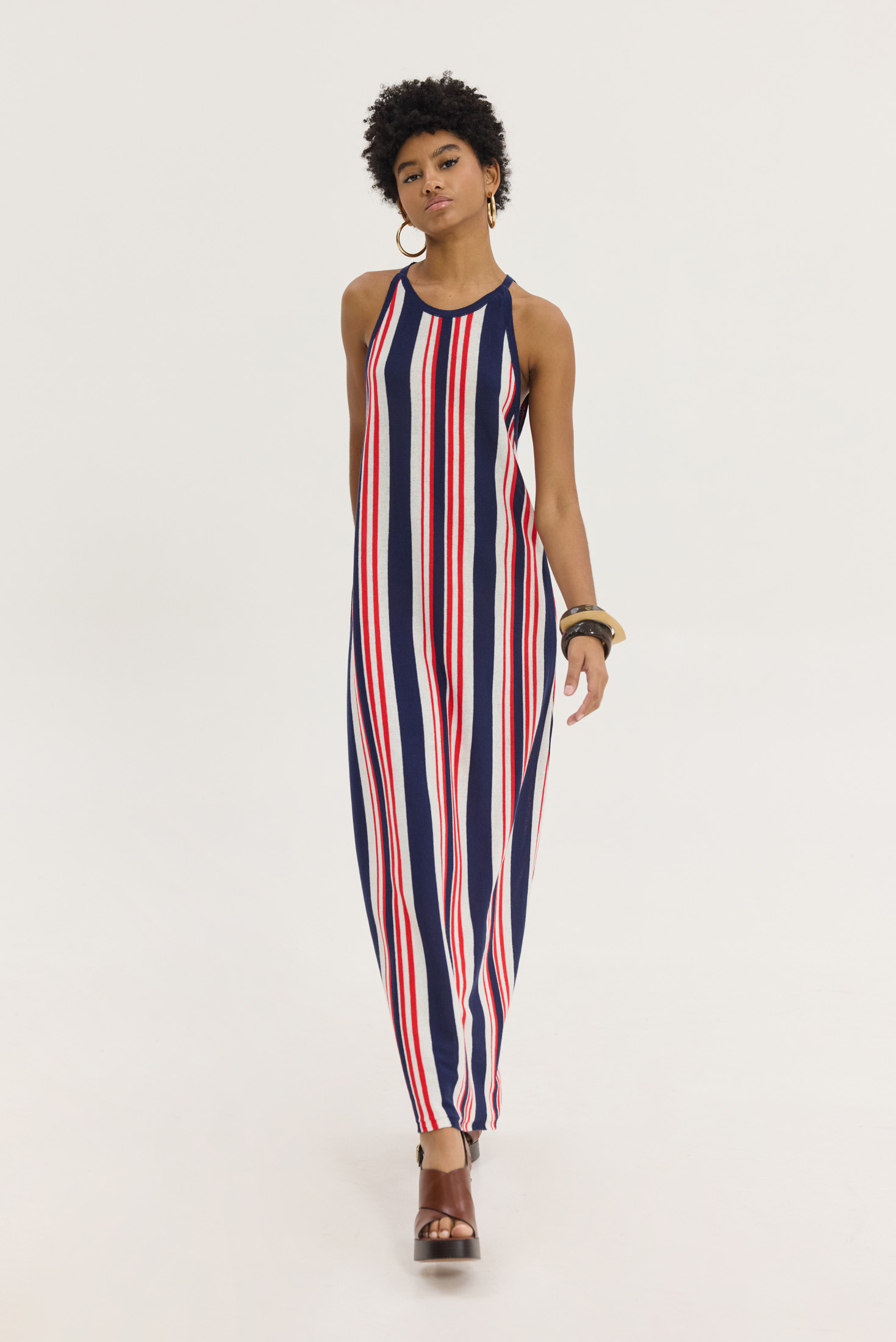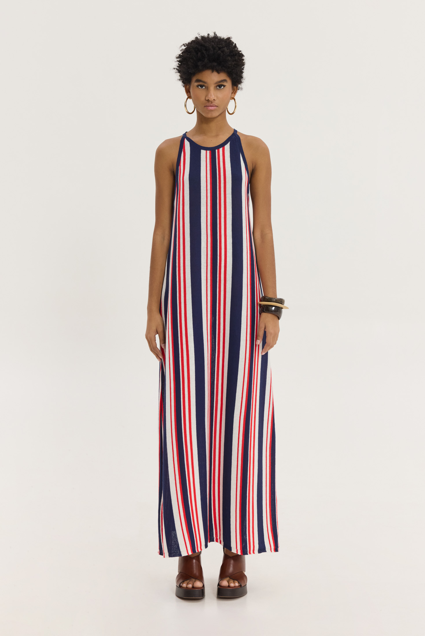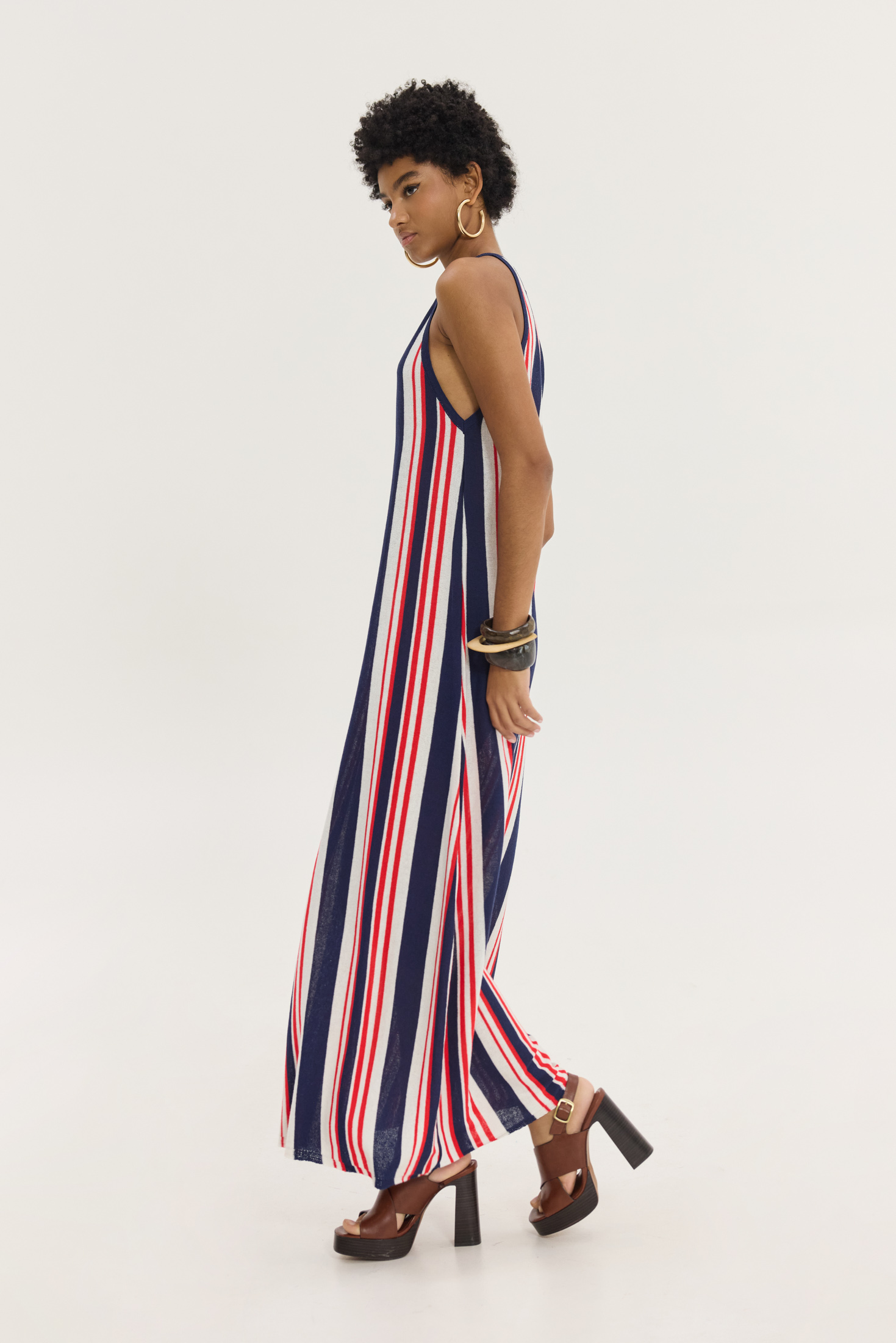 Πλεκτό ριγέ mixi αμάνικο φόρεμα με παρτούς ώμους.