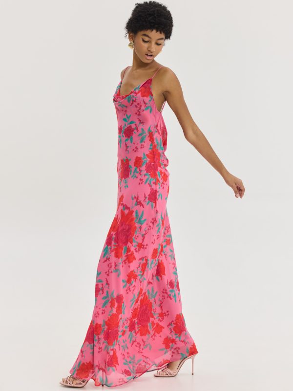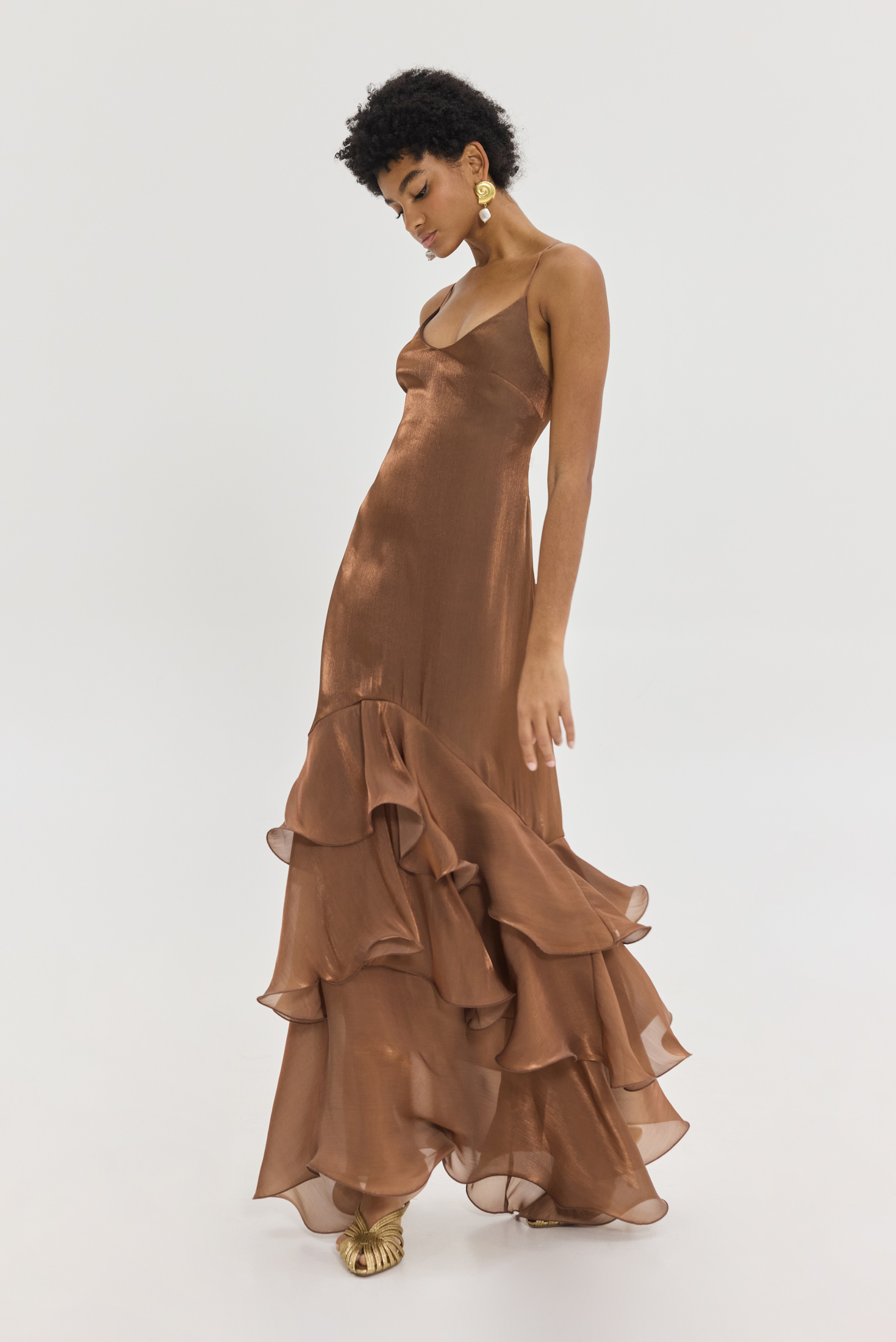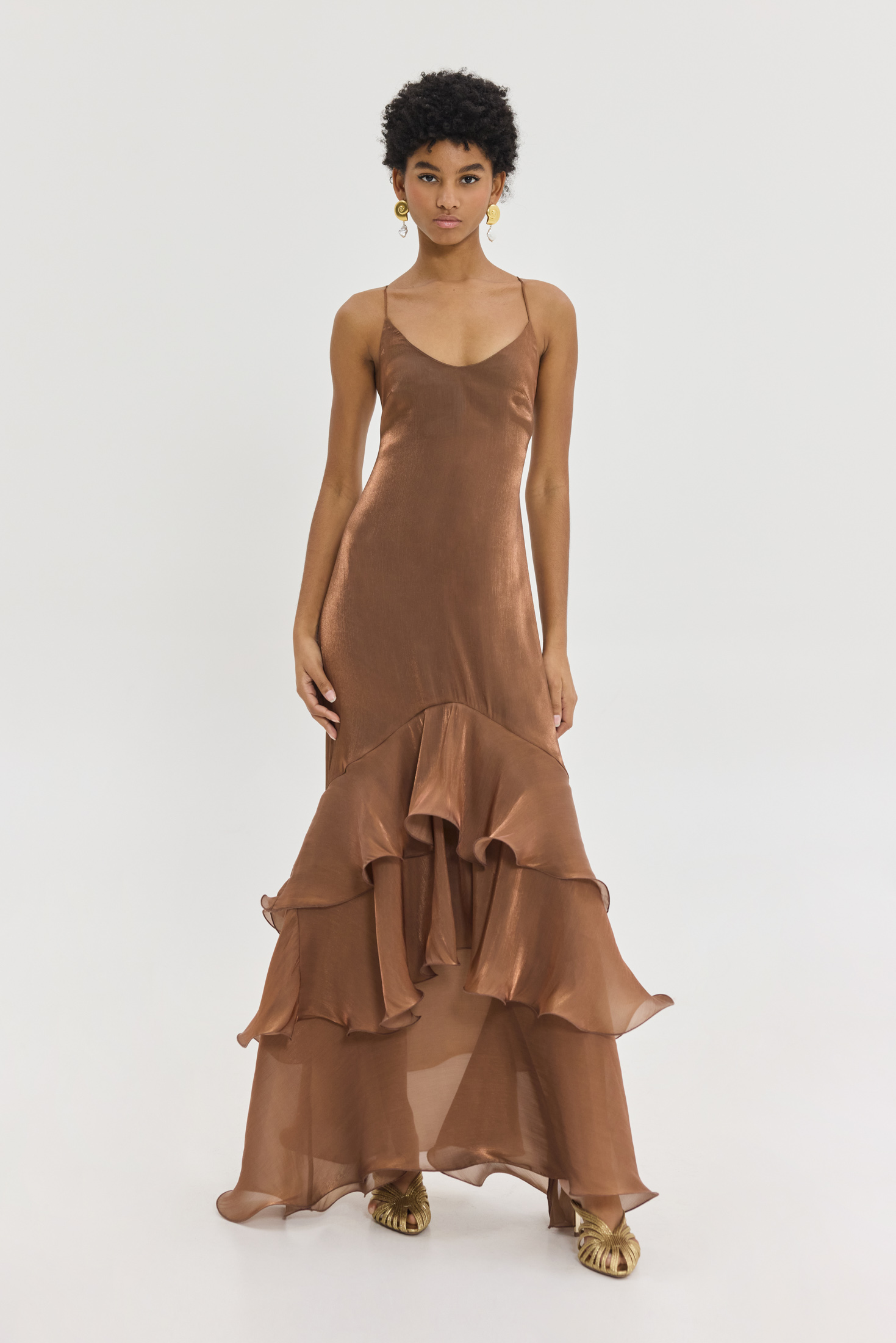Maxi καφέ φόρεμα με ιριδίζουσα κλωστή και ασύμμετρα βολάν.