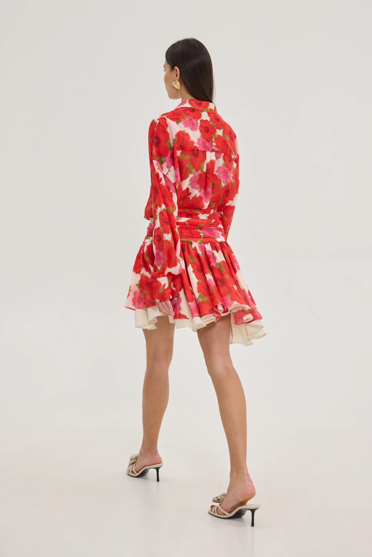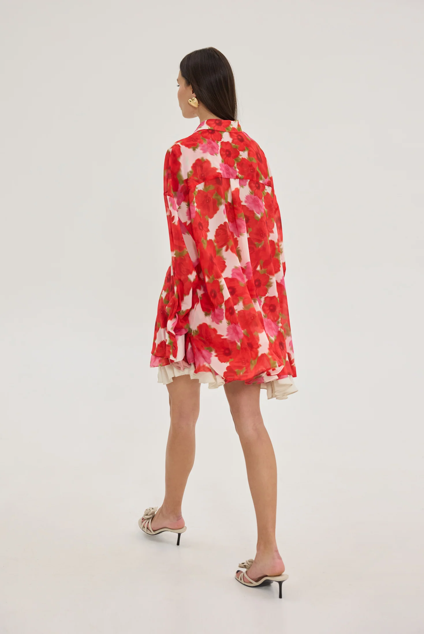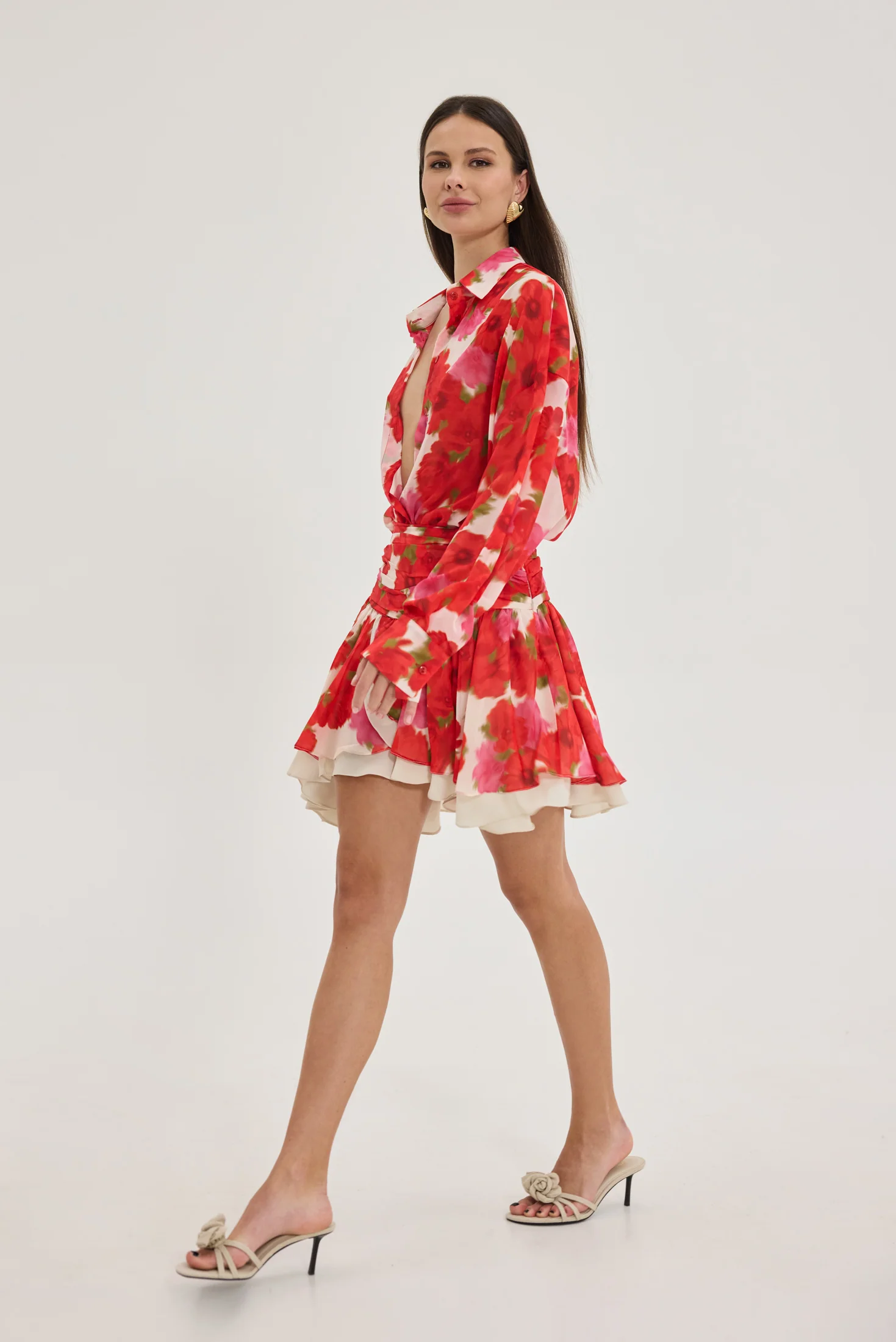 Mini κλος φούστα με βολάν και ασύμμετρο σχέδιο. Αέρινη εφαρμογή με εντυπωσιακό Pattern από λουλούδια σε κόκκινες αποχρώσεις ιδανική για καλοκαιρινά chic look.Για ένα total look συνδυασέτην με το HEMITHEA – HEATHER SHIRT BLOOMING SKY RED.