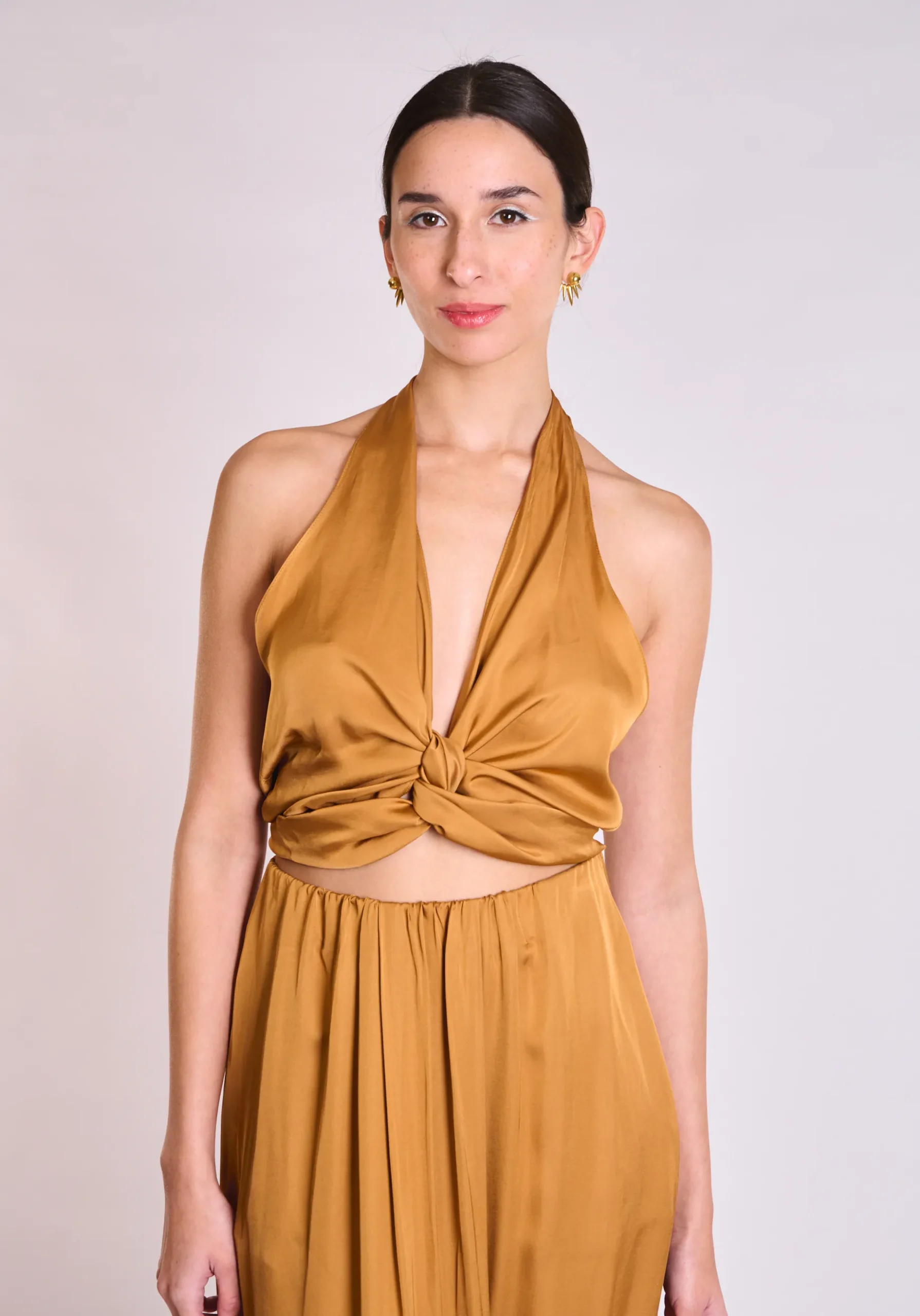 Halter top σε camel απόχρωση με ρευστή γραμμή και minimal design, που συνδυάζει κομψότητα και άνεση σε κάθε εμφάνιση.