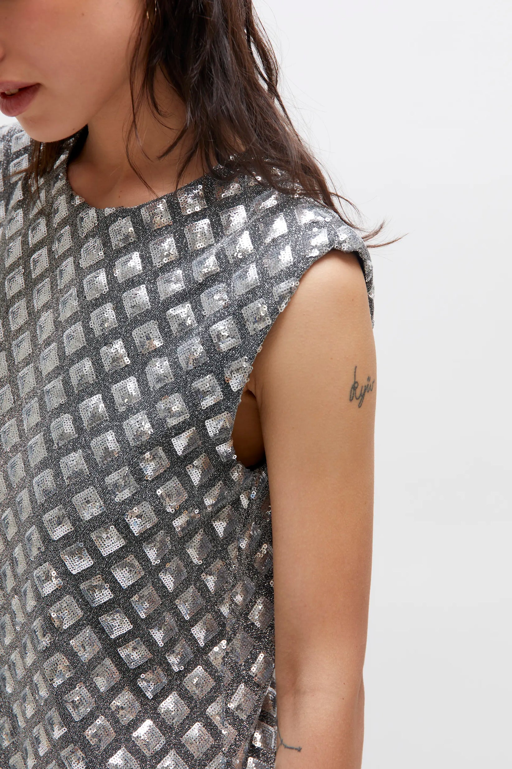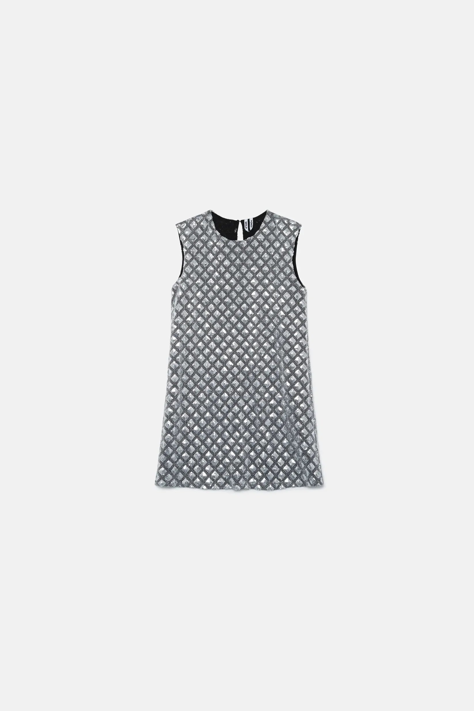 – Κοντό φόρεμα από ύφασμα με ασημί παγιέτες