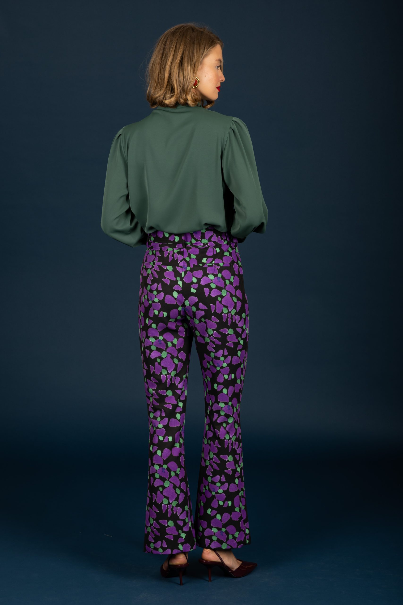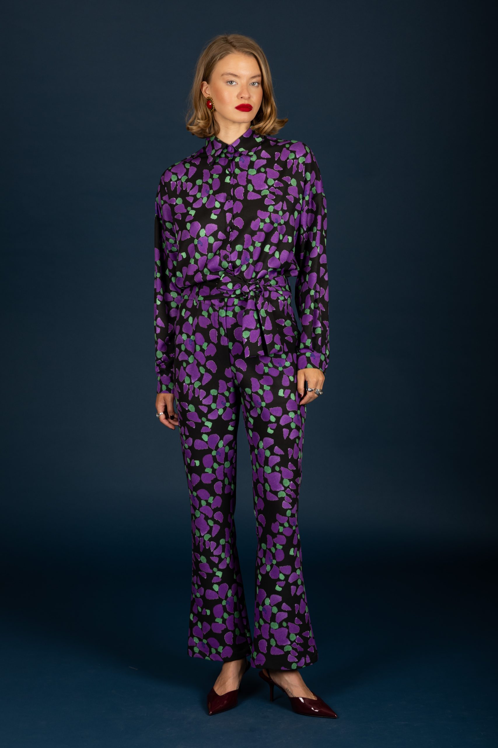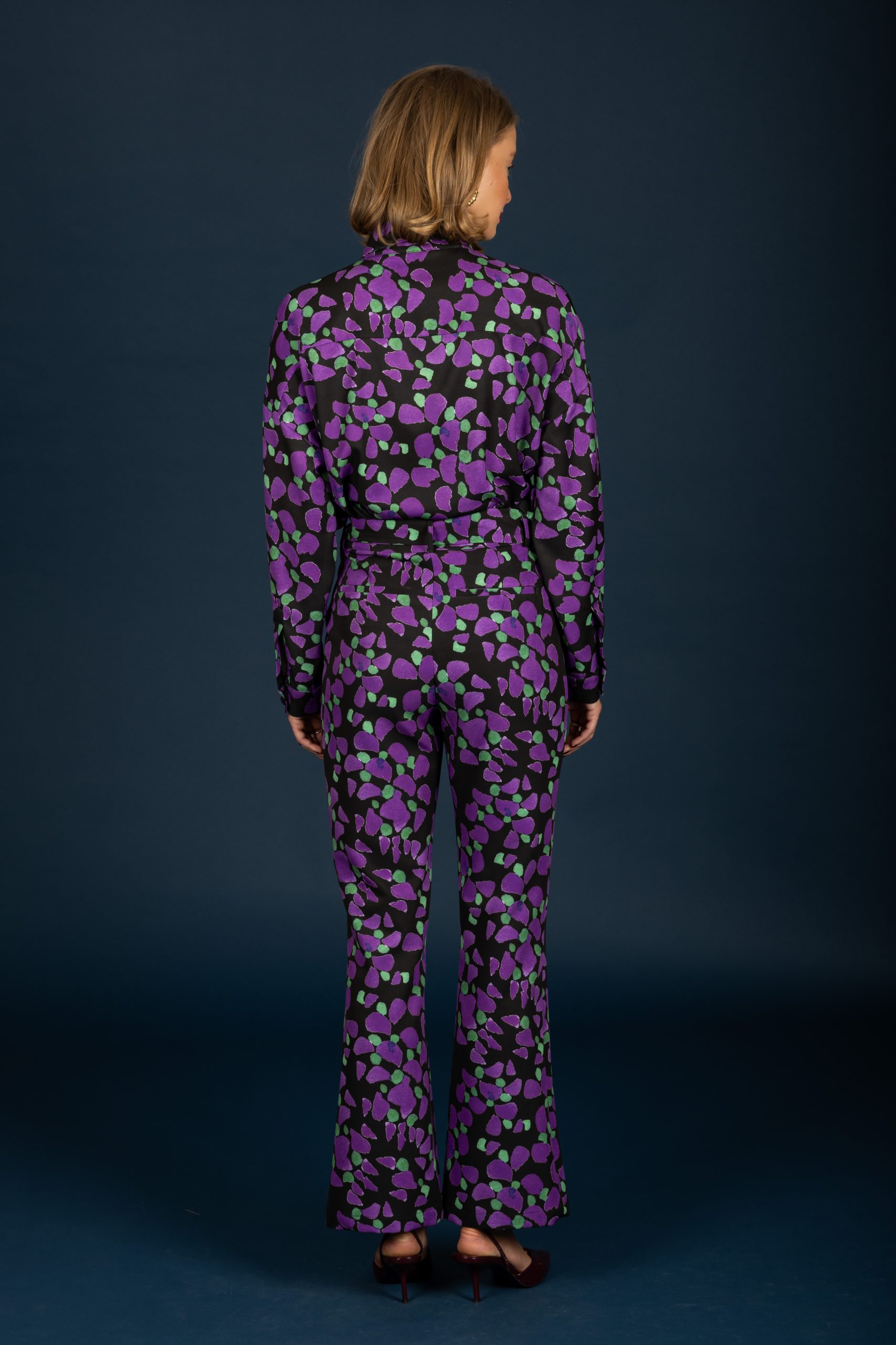 Ύφασμα με έντονο, πολύχρωμο εμπριμέ μοτίβο σε μαύρη βάση, με μωβ και πράσινες αφηρημένες «σταγόνες» ή φυλλώδη σχέδια