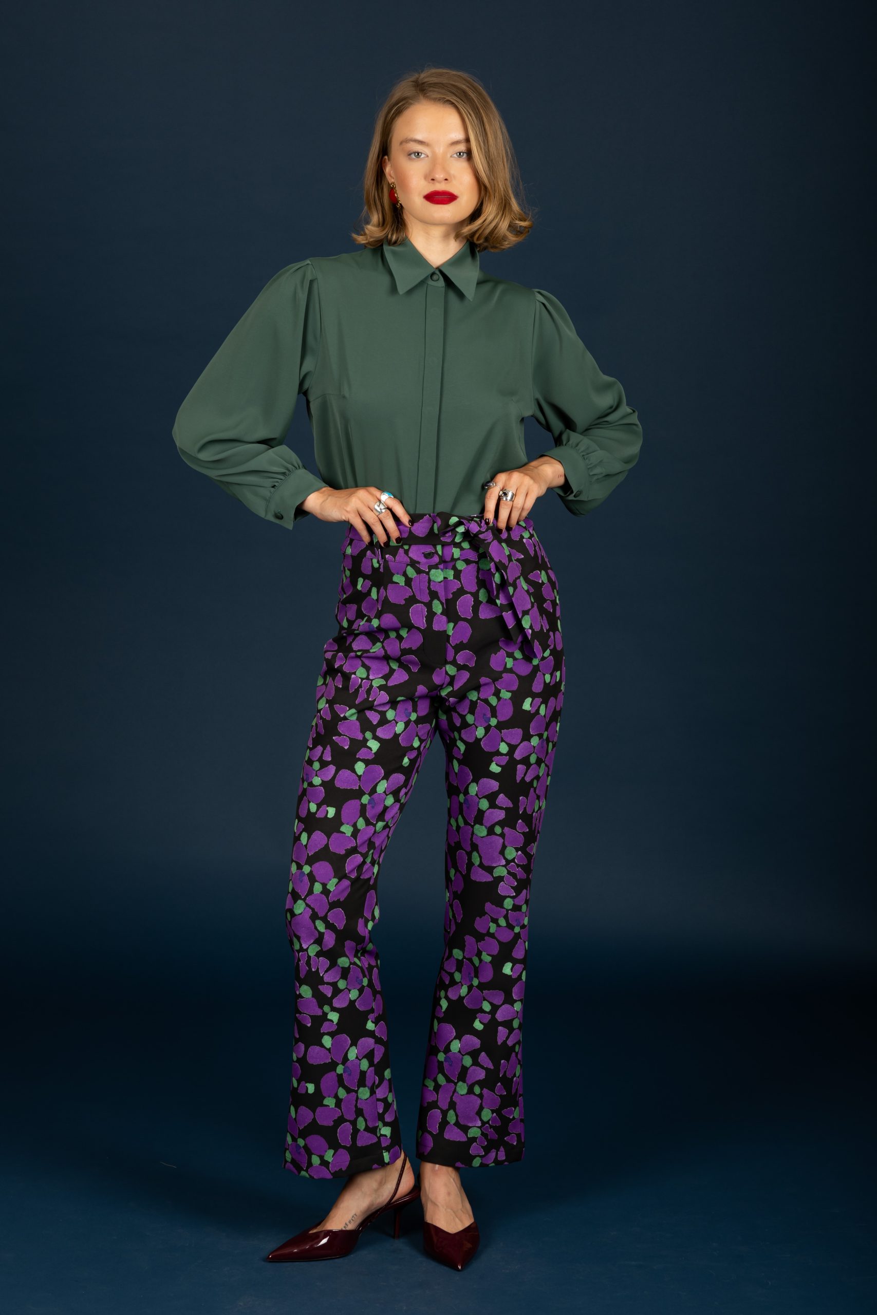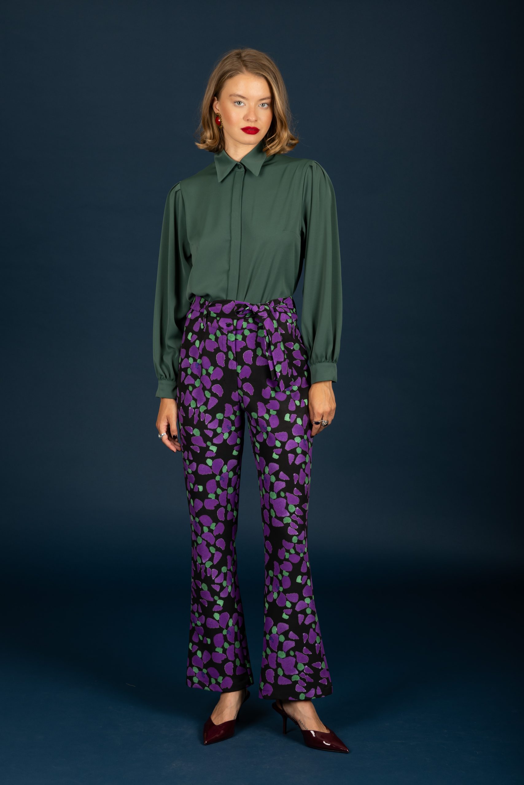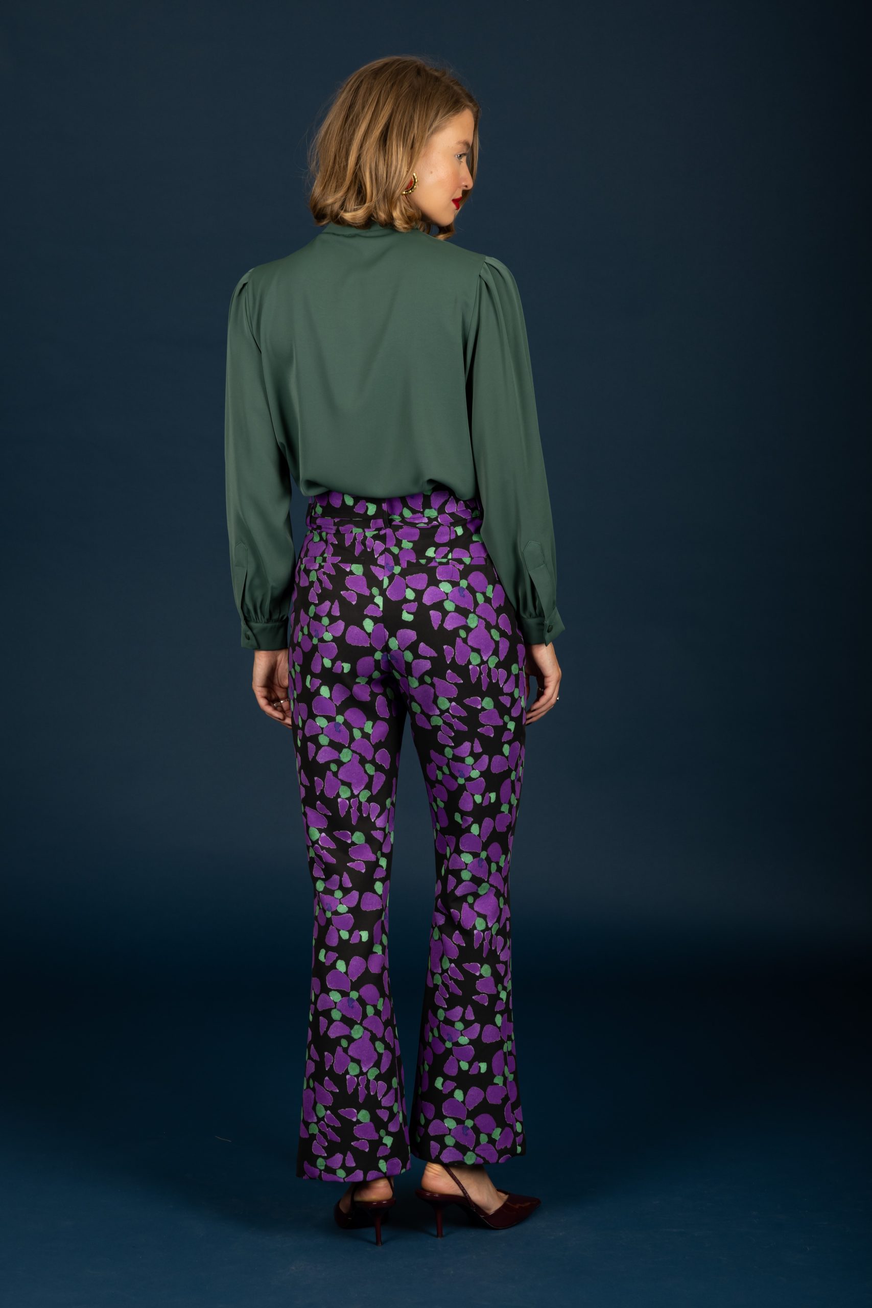 Ύφασμα με έντονο, πολύχρωμο εμπριμέ μοτίβο σε μαύρη βάση, με μωβ και πράσινες αφηρημένες «σταγόνες» ή φυλλώδη σχέδια